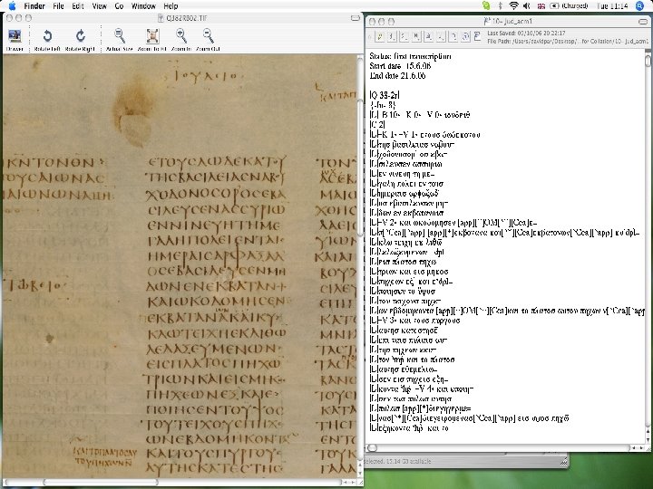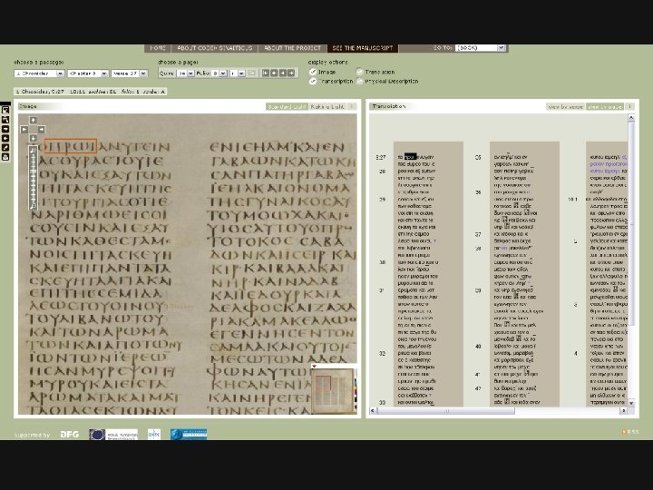 The Project Edition n lead institutions Institute for Textual Scholarship and Electronic Editing (University of Birmingham) n Institute for New Testament Textual Research (University of Münster) n n key elements transcription - made from new images and capturing all layers of text and corrections n searchable text and text features n links to images – whole leaves and details n