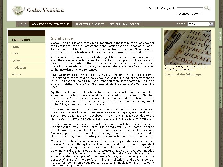 The Project Website Technical specifications: n n bring together a variety of datasets and integrate into a unified user interface n digital images of the leaves of Codex Sinaiticus n XML files for the transcription n Excel spreadsheets for the physical description n XML files for translations, etc. conform to technologies and standards supported by the British Library's IT infrastructure accessibility and long-term maintenance n no plug-ins n web standards such as HTML, CSS, Javascript and AJAX link image and text representations of the pages of Codex Sinaiticus in a way never before implemented in an online edition of a manuscript