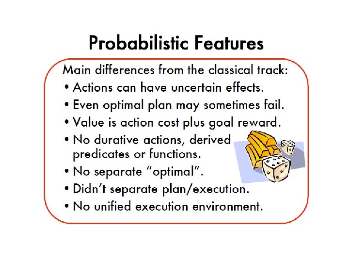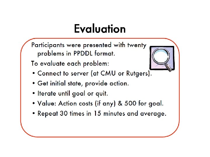 1 st IPPC & Post-Mortem. . IPPC Competitors Results and Post-mortem • • • Most IPPC competitors used different approaches for offline policy generation. One group implemented a simple online “replanning” approach in addition to offline policy generation • – May be we should require that the planners really use probabilities? – May be the domains should somehow be made “probabilistically interesting”? – Determinize the probabilistic problem – • • Most-likely vs. All-outcomes Loop • Get the state S; Call a classical planner (e. g. FF) with [S, G] as the problem • Execute the first action of the plan Umpteen reasons why such an approach should do quite badly. . To everyone’s surprise, the replanning approach wound up winning the competition. Lots of hand-wringing ensued. . • Current understanding: – No reason to believe that off-line policy computation must dominate online action selection – The “replanning” approach is just a degenerate case of hind-sight optimization
