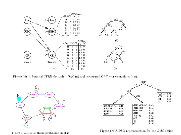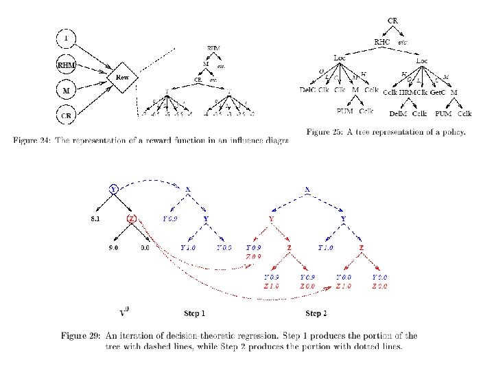 Factored Representations: Reward, Value and Policy Functions • Reward functions can be represented in factored form too. Possible representations include – Decision trees (made up of fluents) – ADDs (Algebraic decision diagrams) • Value functions are like reward functions (so they too can be represented similarly) • Bellman update can then be done directly using factored representations. .