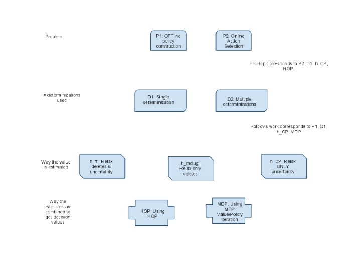 Solving Determinizations • If we relax –ve interactions – Then compute relaxed plan • Admissible if optimal relaxed plan is computed • Inadmissible otherwise • If we keep –ve interactions – Then use a deterministic planner (e. g. FF/LPG) • Inadmissible unless the underlying planner is optimal