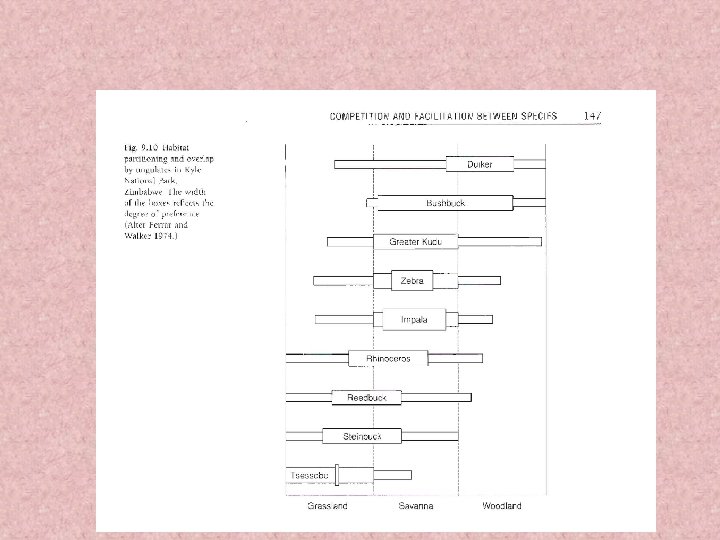 Example • From book: Wildebeest and buffalo in Tanzania, • Co-existence when wildebeest can use grass area where reduced risk from lions • Buffalo can use shrub area because can defend from lions. • Both can use both areas but separation is because of predation risk.