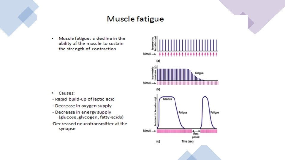 Summation and tetanus Effect of consecutive stimuli: Treppe (warm-up): gradual increase in contraction intensity during sequential stimulation • Summation: Rapid sequence of stimuli muscle twitches fuse into each other, each subsequent one being stronger that its precedent • Tetanus: very rapid sequence of stimuli: no relaxation