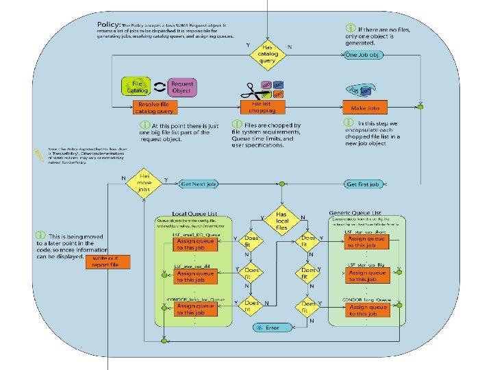 Policies • Resolves request for data sets. • Chops dataset and creates jobs to work on each peace. – Tries to split in most optimal way – Groups files based on where they have to be processed, in case of a files on distributed disk. – The size of each sub-data set is based on the users min and max data set size requirements and the time requirements of the queue calculated from files per hour, if the users supplies this parameter. • Brakes request into jobs • Assigns job objects to queue objects by using a algorithm unique to each policy class.