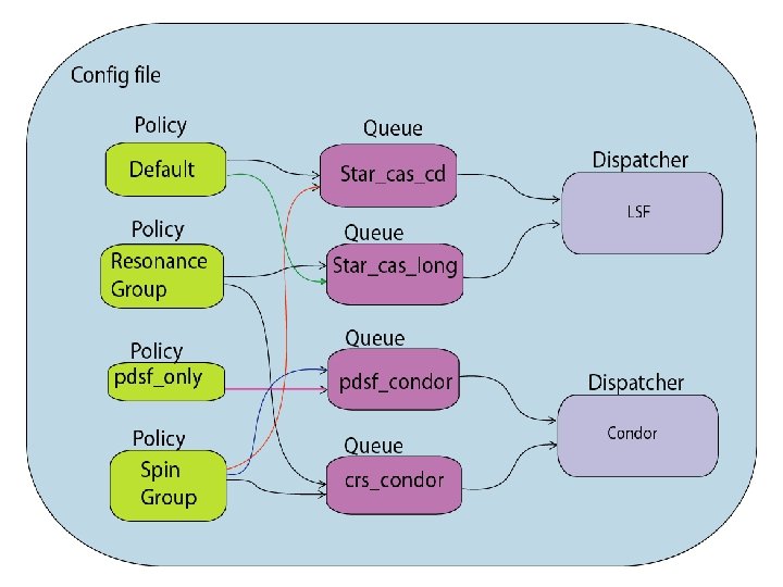 Virtual Queues A typical queue configuration: <object id="NSFlocal. Queue. Obj" class="gov. bnl. star. offline. scheduler. Queue"> <void method="set. ID"> <string>local. Queue</string> <void method="set. Name"> <string>star_cas_dd</string> <void method="set. Associated. Dispatcher"><object idref="RCASDispatcher"/> <void method="set. Cluster"> <string>rcas. rcf. bnl. gov</string> <void method="set. Time. Limit"> <int>90</int> <void method="set. Max. Memory"> <int>440</int> <void method="set. Search. Order. Priority"> <int>1</int> <void method="set. Type"> <string>LSF</string> <void method="set. Implementation"> <string>local</string> </object> </void> </void> </void>