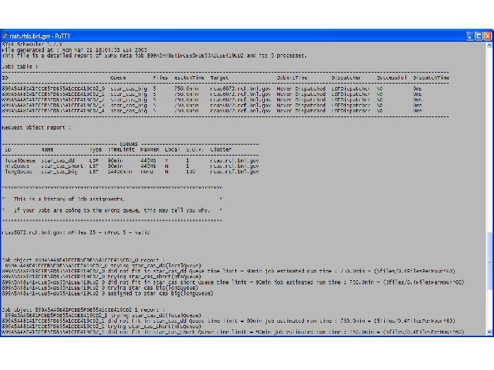 Dispatchers • A scheduler plug-in module, that implements the dispatcher interface, that converts job objects to a “real” job actually submitted to the batch system • Currently available dispatchers: – – – – Boss Condor. G Local (new) LSF PBS SGE (new but heavily tested by PDSF)
