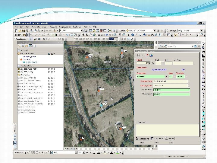 The Path to a Solution �We extracted all addresses from our AS 400(tax database) �Asked for ideas at a Pee Dee Users Group meeting �Consulted with BCS �Geocoded addresses from excel file �Moved addresses with a corresponding parcel number to the center of the parcel �Went through the unmatched addresses from the Geocode and corrected any errors in centerlines