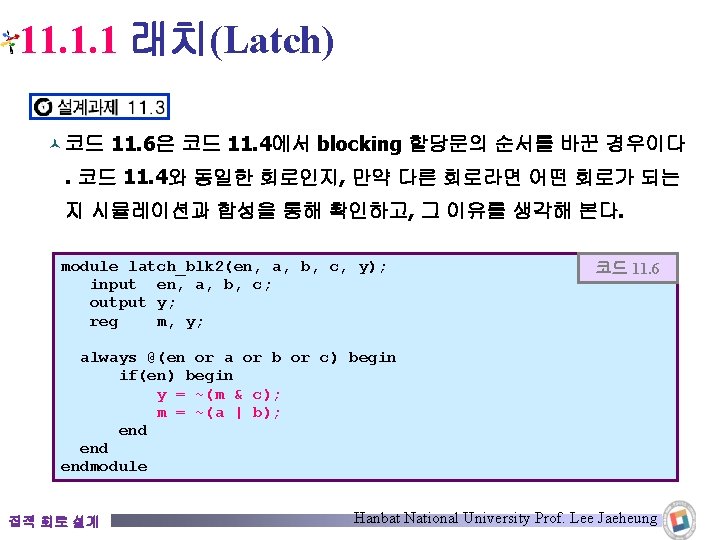 11. 1. 1 래치(Latch) © Latch가 포함된 회로에 nonblocking 할당문이 사용된 경우 module latch_nonblk(en, a, b, c, y); input en, a, b, c; output y; reg m, y; always @(en or a or b or c) begin if(en) begin m <= ~(a | b); y <= ~(m & c); end endmodule Latch 코드 11. 5 합성 결과 Latch 집적 회로 설계 Hanbat National University Prof. Lee Jaeheung