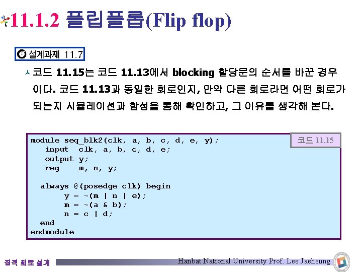 11. 1. 2 플립플롭(Flip flop) © 플립플롭이 포함된 회로에 blocking 할당문이 사용된 경우 module seq_blk(clk, a, b, c, d, e, y); input clk, a, b, c, d, e; output y; reg m, n, y; always @(posedge clk) begin m = ~(a & b); n = c | d; y = ~(m | n | e); endmodule 코드 11. 13 합성 결과 Flip Flop 집적 회로 설계 Hanbat National University Prof. Lee Jaeheung