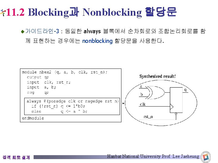 11. 2 Blocking과 Nonblocking 할당문 module ba_nba 3(q, a, b, clk, rst_n); output q; input a, b, rst_n, clk; reg q; always @(posedge clk or negedge rst_n) if(!rst_n) q <= 1'b 0; else q <= a & b; endmodule ba_nba 4(q, a, b, clk, rst_n); output q; input a, b, rst_n, clk; reg q; wire tmp; Good Coding 코드 11. 18(c) assign tmp = a & b; always @(posedge clk or negedge rst_n) if(!rst_n) q <= 1'b 0; else q <= tmp; endmodule 집적 회로 설계 코드 11. 18(d) Hanbat National University Prof. Lee Jaeheung