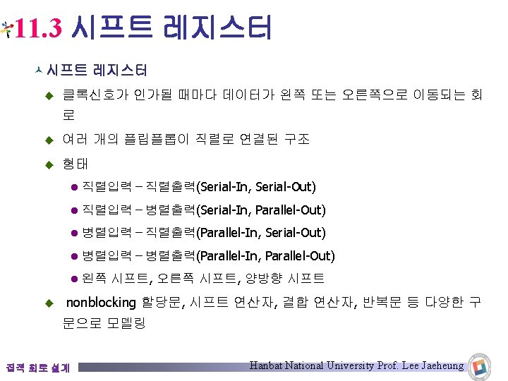 11. 3. 2 병렬입력-병렬출력 시프트 레지스터 © 병렬입력-병렬출력 시프트 레지스터 pout[8] din[8] load Q MUX D DFF pout[2] din[2] pout[1] load Q MUX D DFF load Q din[0] din[1] pout[0] MUX D DFF Q D DFF clk rst 그림 11. 19 병렬입력-직렬출력 시프트 레지스터 집적 회로 설계 Hanbat National University Prof. Lee Jaeheung