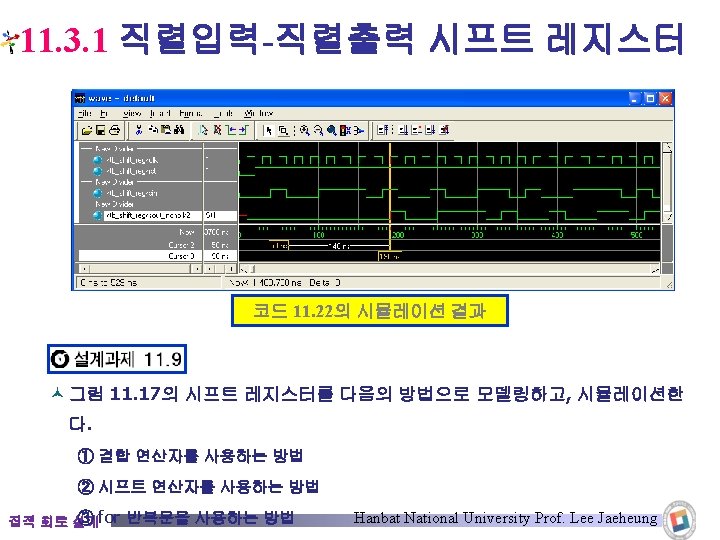 11. 3. 1 직렬입력-직렬출력 시프트 레지스터 module shift_reg_nblk 2(clk, rst, sin, sout); input clk, rst, sin; output sout; reg [7: 0] q; assign sout = q[7]; always @(posedge clk) begin if(!rst) q <= 0; else begin q[0] <= sin; q[7: 1] <= q[6: 0]; end endmodule 벡터 할당문을 사용한 경우 집적 회로 설계 코드 11. 22 Hanbat National University Prof. Lee Jaeheung