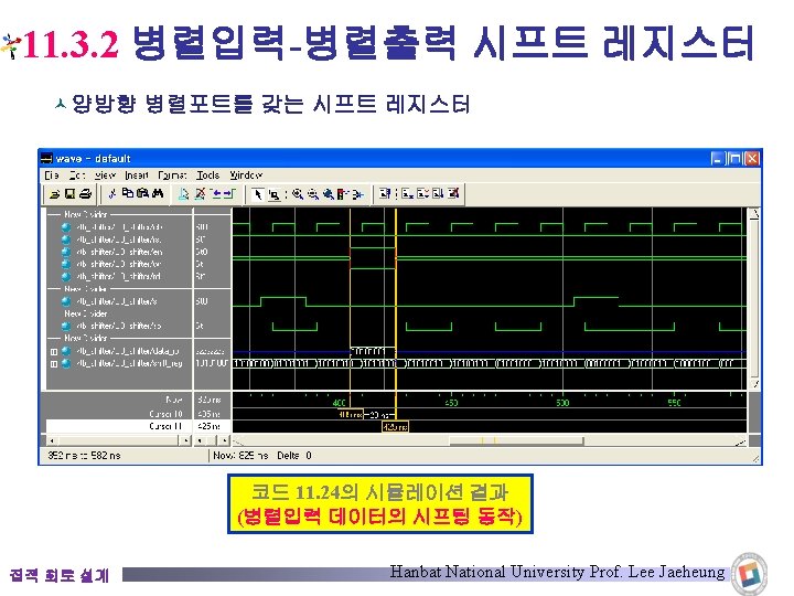 11. 3. 2 병렬입력-병렬출력 시프트 레지스터 module pld_shift_reg(clk, rst, load, din, pout); input clk, rst, load; input [7: 0] din; output [7: 0] pout; reg [7: 0] data_reg; assign pout = data_reg; always @(posedge if(!rst) else if(load) else endmodule 집적 회로 설계 clk) begin data_reg <= 0; data_reg <= din; data_reg <= data_reg << 1; 코드 11. 23 Hanbat National University Prof. Lee Jaeheung