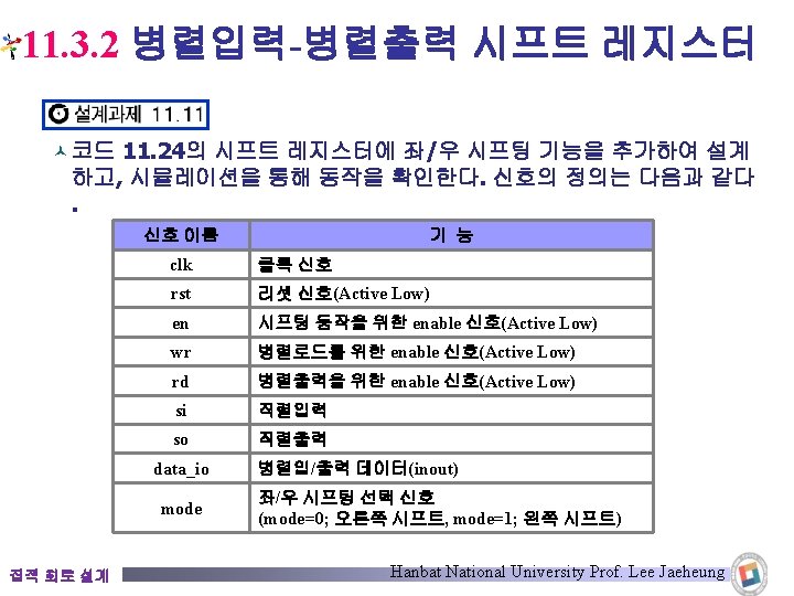 11. 3. 2 병렬입력-병렬출력 시프트 레지스터 © 양방향 병렬포트를 갖는 시프트 레지스터 module shifter(clk, rst, en, wr, rd, si, so, data_io); parameter Len = 8; input clk, rst, en, wr, rd, si; output so; inout [Len-1: 0] data_io; reg [Len-1: 0] shift_reg; assign data_io = !rd ? shift_reg : {Len{1'bz}}; assign so = shift_reg[7]; always @(posedge clk) begin if(!rst) shift_reg <= {Len{1'b 0}}; else begin if(!en) begin shift_reg <= shift_reg << 1; shift_reg[0] <= si; end else if(!wr) shift_reg <= data_io; end endmodule 집적 회로 설계 코드 11. 24 Hanbat National University Prof. Lee Jaeheung