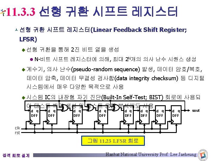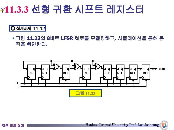 11. 3. 3 선형 귀환 시프트 레지스터 © 3비트 LFSR module lfsr_Good 1(q 3, clk, pre_n); output q 3; input clk, pre_n; reg q 3, q 2, q 1; // Nonblocking 할당문을 사용한 경우 always @(posedge clk or negedge pre_n) if(!pre_n) begin q 3 <= 1'b 1; q 2 <= 1'b 1; q 1 <= 1'b 1; end else begin q 3 <= q 2; q 2 <= q 1 ^ q 3; q 1 <= q 3; endmodule 집적 회로 설계 Good Code 코드 11. 25(b) Hanbat National University Prof. Lee Jaeheung