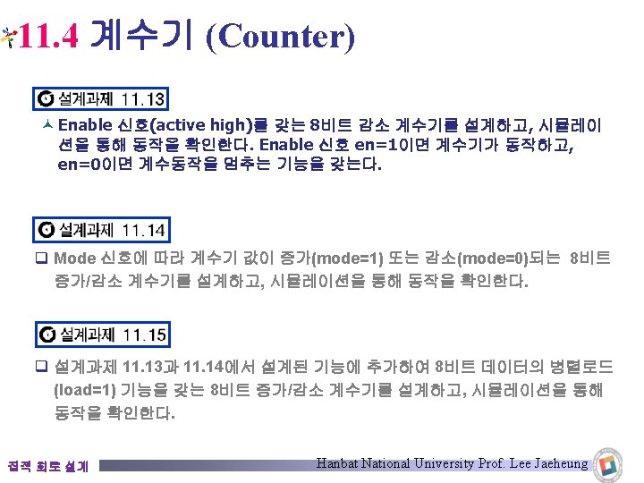 11. 4 계수기 (Counter) © 8비트 증가 계수기 코드 11. 26의 시뮬레이션 결과 집적 회로 설계 Hanbat National University Prof. Lee Jaeheung