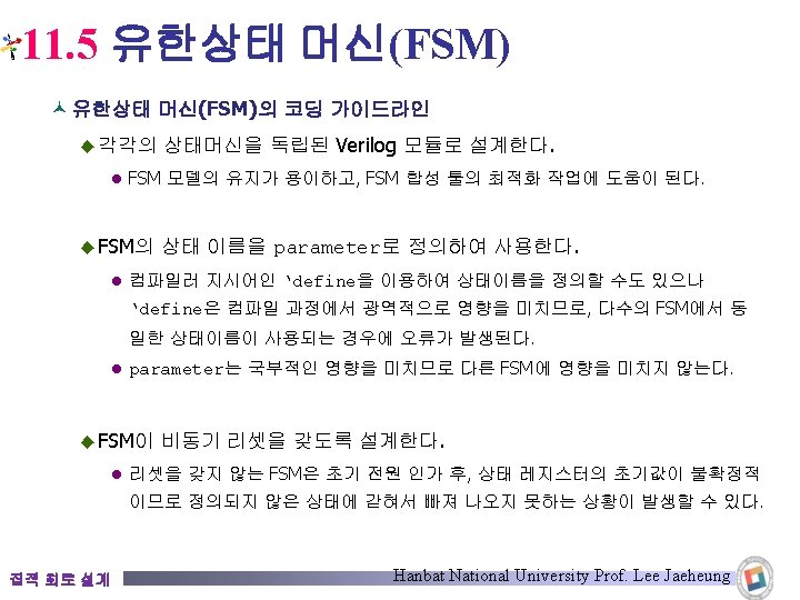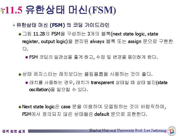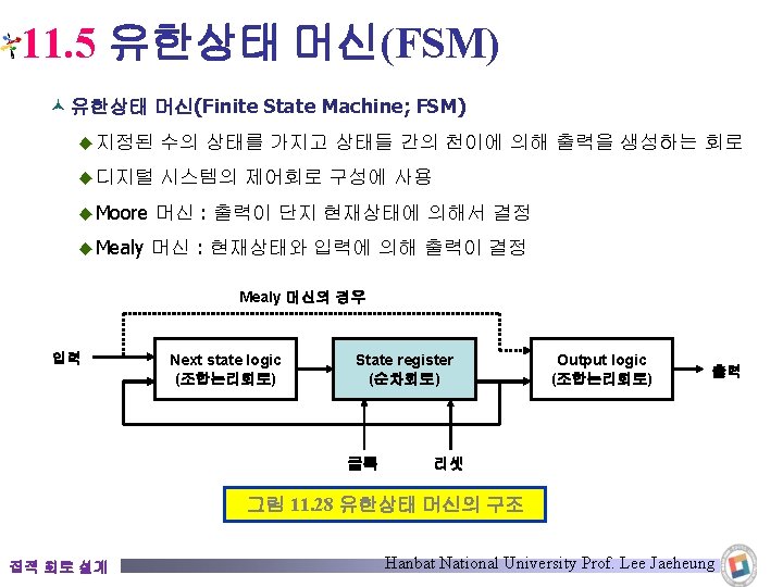 11. 5. 2 Mealy FSM din_bit : detect_out : 0 1 1 0 0 0 0 0 0 1 1/0 start reset 0/0 0/0 st 4 1/0 0/1 1/0 st 3 집적 회로 설계 st 1 1/0 0/0 st 2 Hanbat National University Prof. Lee Jaeheung