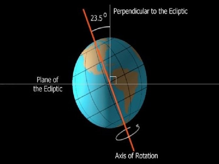 Rotation • Earth rotates counter clockwise into the sun’s light if you are looking down on the North pole (night and day). • Axis: 23½º (tilt) –Imaginary line that passes through Earth’s center at the N & S Poles.