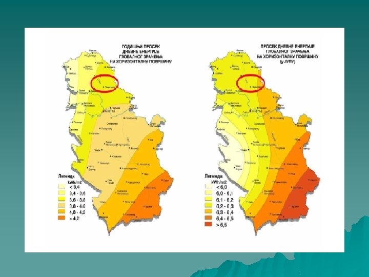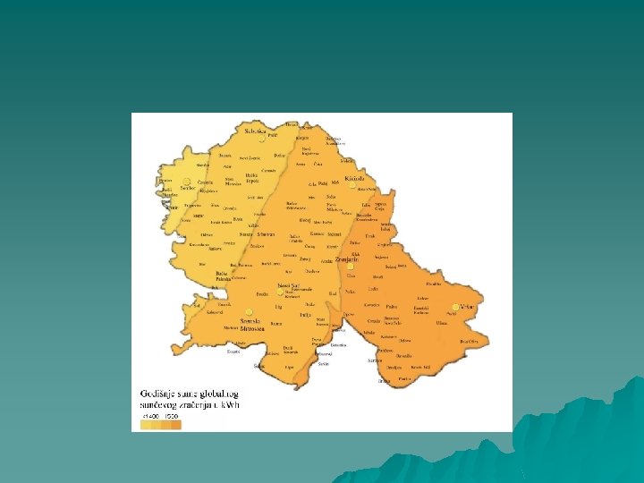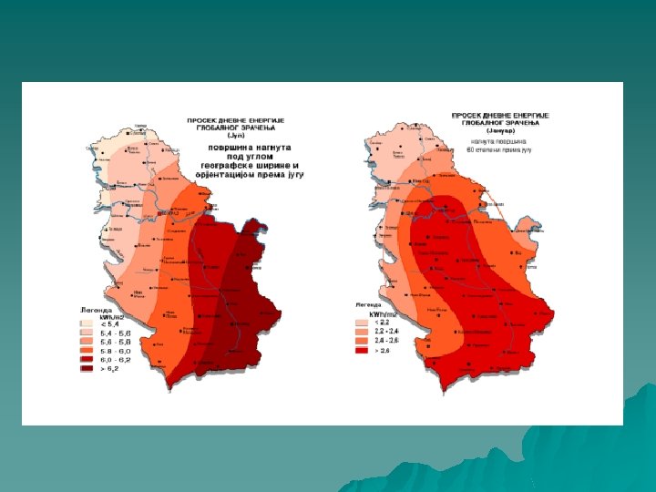 Sunčevo zračenje u Srbiji i Vojvodini u Sunčevo zračenje u Srbiji je u proseku veće za oko 40% od Evropskog proseka. u Najniže izmerene vrednosti sunčevog zračenja u Srbiji se mogu uporediti sa najvišim vrednostima u vodećim zemljama solarnog korišcenja, kao što su Nemačka i Austrija. u U cilju poredjenja, prosečna vrednost globalnog zračenja za teritoriju Nemacke iznosi oko 1. 000 k. Wh/m 2 , dok je za Srbiju ta vrednost oko 1. 400 k. Wh/m 2.