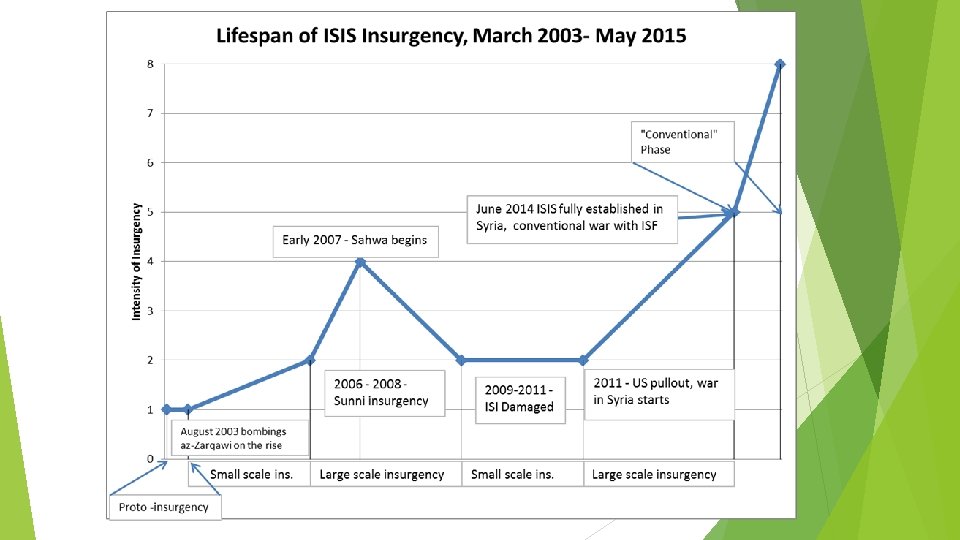 Po smrti az-Zarqáwího vedl AQI Abú Ajjub al-Masrí, nicméně v listopadu 2006 přísahal věrnost Abú Omarovi al-Bagdádímu, který založil „Islámský stát v Iráku“ (ISI) -> předehra k rozchodu mezi al-Kájdou a ISI/ISIS ISI často operovala společně s dalšími sunnitskými rebely, nicméně postupně se lokálním kmenovým vůdcům a ostatním rebelům jejich radikální ideologie, snahy dominovat byznysu (rozuměj černému trhu, kriminálním aktivitám, vybírání výpalného apod. ) začala zajídat -> rozkol mezi saláfisty a „nacionalisty“ vedl k požadavku na „sunnitské povstání pro Iráčany“ -> projekt „Sons of Iraq“ (al-Sahwa) – sunnitské kmenové milice bojující s federální vládou a Američany proti ISI V roce 2008 již ISI byl oslaben, donucen se z mnoha oblastí stáhnout, přesunul se do Mosulu a spíše než na „ofenzivní operace“ se soustředí na kriminální aktivity Abú Omar al-Bagdádí byl zabit v dubnu 2010 2009 -2011 opět povstání malého rozsahu