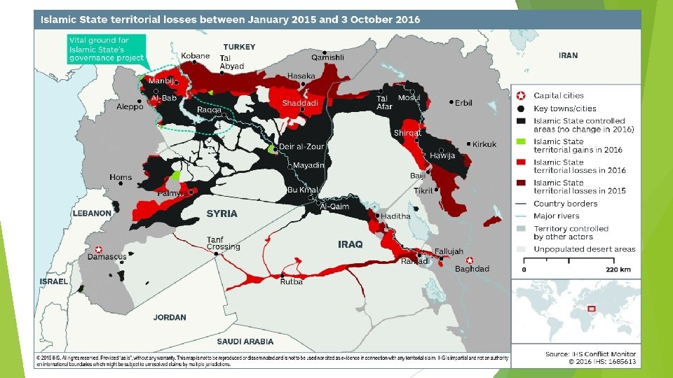 ISI po roce 2011 V r. 2010 se lídrem stal Abú Bakr al-Bagdádí Po stažení Američanů v roce 2011 opět viditelnější přítomnost ISI Pokračující marginalizace sunnitů (objektivně i subjektivně) ze strany Málikího federální vlády, nedodržené sliby o sdílení moci, pozice pro Sons of Iraq, tvrdé potlačování sunnitských protivládních protestů 2012 -2013 -> silný „root cause“ Opět pozvolný posun k povstání velkého rozsahu Od roku 2012 expanze ISIS do Sýrie (Džabhat an-Nusra), od dubna 2013 ISIS 2014 monopol v Raqqa, Dajr az-Zaur, Manbídž… Červen/červenec 2014 podstatné části sunnitských oblastí Iráku 2015, 2016 – postupné oslabování ISIS, ztráta území, domácí odpor…