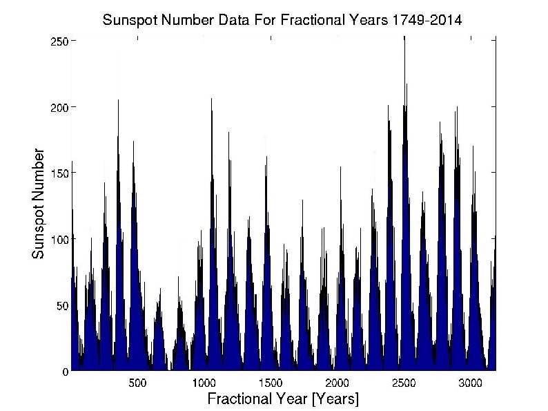 Sunspot Number Data For Fractional Years 1749 -2014 ● This is an area graph, much like the previous slide, yet I believe this graph conveys the message more clearly than the previous slide. Here we are only looking at sunspot number; deviation is not included. Sunspot number is plotted against fractional years. The sunspot number data seems to have a trend of low sunspot numbers in the first few months and begin to rise over the next few months with their peak at the 11 th month. ● ● ● After the 11 th month, the sunspot number begins to decrease and the pattern is repeated. I wonder what would happen if I broke down the data into every 10 years and compared the graphs. This current graph is very crowded and it would be nice to see the individual peaks closer within a shorter time period. I wanted to try and learn how to do a contour map to convey the information, but I am unsure of how to do it/ when I tried, it did not turn out right. Because the image is zoomed out so far, it looks like there is both black and blue on this image, but there is actually only blue when you zoom in – how can I fix this? I honestly like this graph better than the first graph because there is less (not by much) going on than the previous slide. ● ● ●