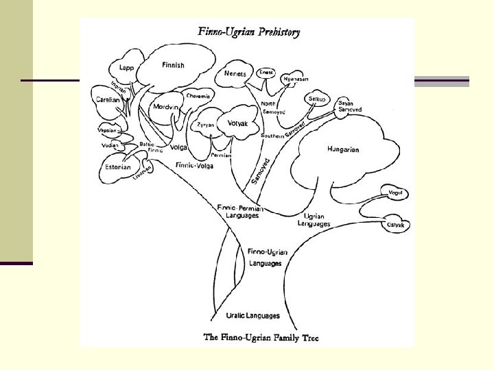 Historiallis-vertaileva tutkimus n perustuu äännehistoriaan ja äännemuutosten tutkimiseen n etsitään systemaattisia äännevastaavuuksia n kielioppia ja äännevastaavuudet tärkeämpiä kuin sanasto n useissa kielissä samannäköisiä sanoja (sattumaa!) n esimerkki suomesta ja unkarista sm kala unk hal << * kala kota unk ház ’talo’ kuusi unk hat ’ 6’ suom. -ugr. kantakielen sananalkuinen *k on muuttunut unkarissa takavokaalin edellä h: ksi etuvokaalin edellä k on säilynyt, esim. käsi unk kéz, kerjätä unk. kér ’pyytää’
