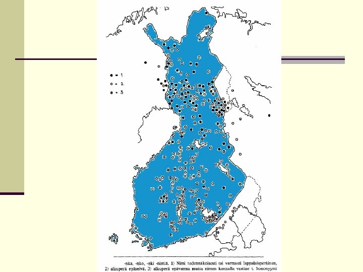 n Nuuksio < saame njukca ’joutsen’ n Lieksa 'suo’ n Oulu 'tulvavesi’ n Simpele, < *timpil saame dappal ’tasaisesti virtaava alue koskessa’ n saamelaisperäisiä johdinaineksia, mm. nk. V Luhanka, Maaninka, Kiiminki n puuttuvat lounaisimmasta osasta Suomea