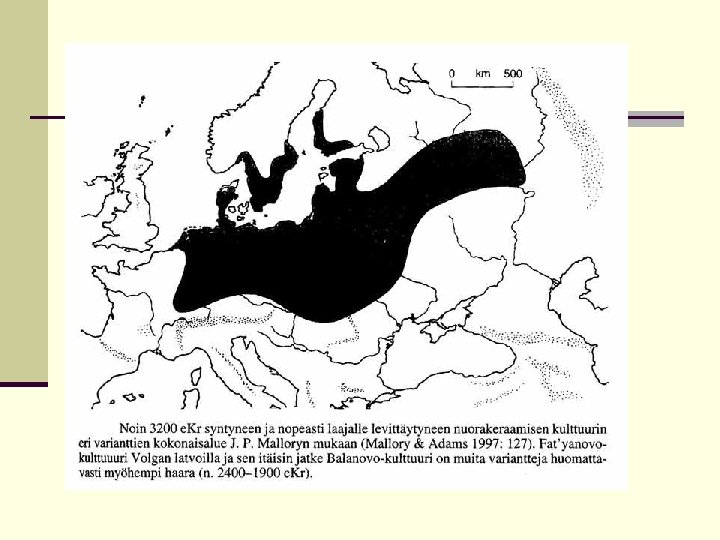 Neoliittinen kivikausi n Tyypillinen kampakeramiikka Suomeen ja Karjalaan n. 3 900 e. Kr. n Kampakeramiikka yhdistetään uralilaisia kieliä puhuneisiin väestöihin. n vasarakirveskulttuuri eli nuorakeraaminen kulttuuri Lounais-Suomeen n. 3 200 e. Kr. Ø yhdistetty ind. eur. kieltä puhuvaan populaatioon