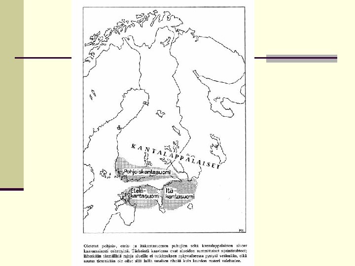 n Nykyisen Suomen alue asutettu heti jään sulamisen jälkeen (8000 e. Kr. ) n kolme teoriaa kielestä: 1) puhuivat uralilaista kielimuotoa 2) puhuivat tuntematonta kieltä (peruste: suomessa on 250 sanaa, joilla ei vastineita sukukielissä tai naapurikielissä) 3)puhuivat useita eri kieliä