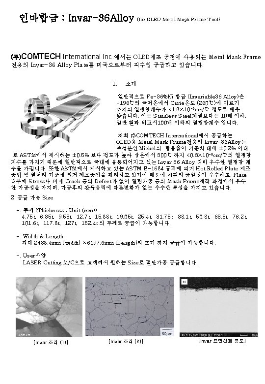 인바합금 : Super Invar Alloy (for OLED Metal Mask Frame Tool) 4. Machinability Data Tool Configuratio n Surface Speed Feed Rate Rough/Finish 320 in. /min. 1. 0 in. /min. HSS Rough Milling 375 in. /min 2. 0 in. /min. HSS Finish Milling Up to 600 in. /min. 4. 0 in. /min. Tool Type Use End Mill Carbide End Mill Corn Cob) End Mill