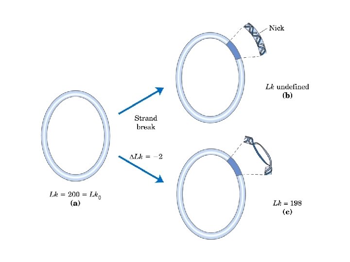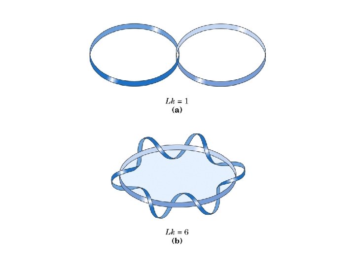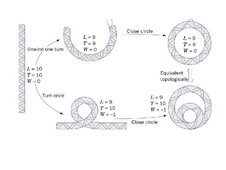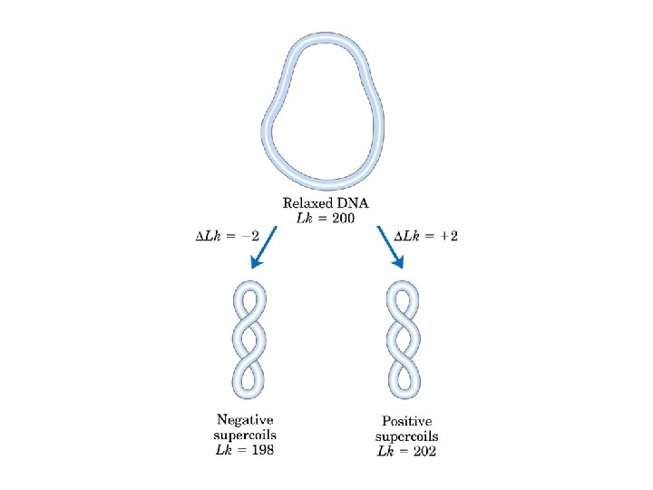 Supercoiling of DNA 2. Numerical expression for degree of supercoiling A. Equation Lk=Tw+Wr B. L: linking number, # of times that one DNA strand winds about the others strands, is always an integer C. T: twist, # of revolutions about the duplex helix D. W: writhe, # of turns of the duplex axis about the superhelical axis by definition the measure of the degree of supercoiling E. specific linking difference or superhelical density=DLk/Lk 0