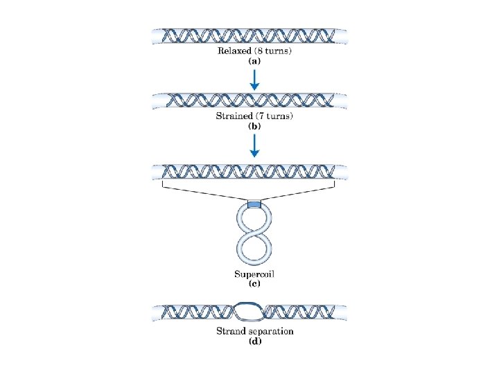 Supercoiling of DNA 1. Topology A. Right handed supercoiling = negative supercoiling (underwinding) B. Left handed supercoiling = positive supercoiling C. Relaxed state is with no bends D. DNA must be constrained: plasmid DNA or by proteins E. Unraveling the DNA at one position changes the superhelicity F. Topology only defined for continuous deformation - no strand breakage