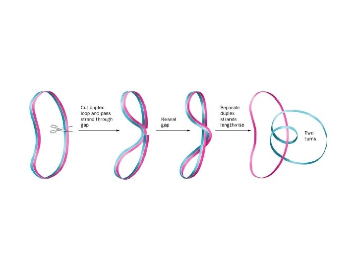 Supercoiling of DNA 4. Topoisomerases are required to relieve torsional strain A. Topoisomerases I - breaks only one strand i. monomeric protein ii. after nicking DNA the 5'-PO 4 is covalently linked to enzyme (prokaryotes) or the 3' end is linked to the enzyme (eukaryotes) iii. evidence is the formation of catenates iv. E. coli Topo I relaxes negatively supercoiled DNA v. introduces a change of increments of 1 in writhe