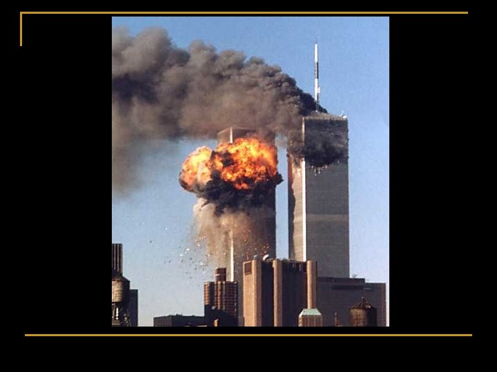 ¿ Porqué el terrorismo atrajo una considerable atención en el 2001? n n El riesgo de morir a causa del terrorismo fue extremedamente bajo en 1990’s, y estaba relativamente bajo comparado con algunas enfermedades en 2001 Pero la tasa de mortalidad se incrementó 500 veces en 2001 debido a Sept. 11 La tasa general de mortalidad debida al terrorismo no ha sido alta A pesar del bajo riesgo, el choque, sorpresa y miedo absorvieron a los Estados Unidos y al mundo
