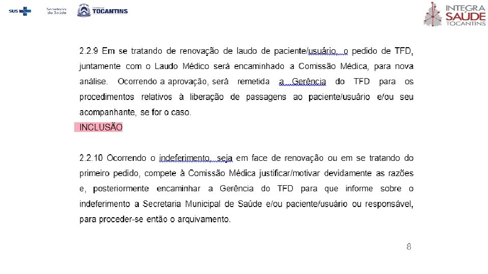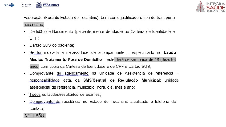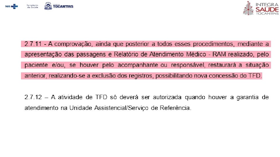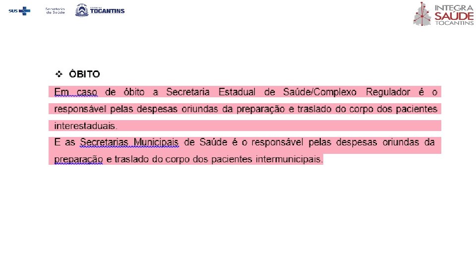 v ÓBITO ü A responsabilidade pela contratação dos serviços em caso de óbito de pacientes em TFD interestadual será do Gestor Estadual, através do setor TFD. E em casos de óbito em TFD intermunicipal, a responsabilidade será do Município através da Secretaria Municipal de Saúde. ü As despesas permitidas no caso de óbito são de preparação do corpo, urna, emolumentos cartoriais e translado até a cidade de origem (esta sendo obrigatoriamente pertencente ao Estado do Tocantins, conforme cartão SUS do paciente no momento da confecção do laudo TFD). Despesas relativas a flores, túmulo, dentre outros, não estão contemplados pelos serviços contratados pelo TFD. ü Nos casos de óbito em TFD interestadual, em que não for realizado contato prévio para solicitação dos serviços de preparo e translado do corpo via setor TFD, esta Secretaria de Estado não se responsabilizará por ressarcimento das despesas.