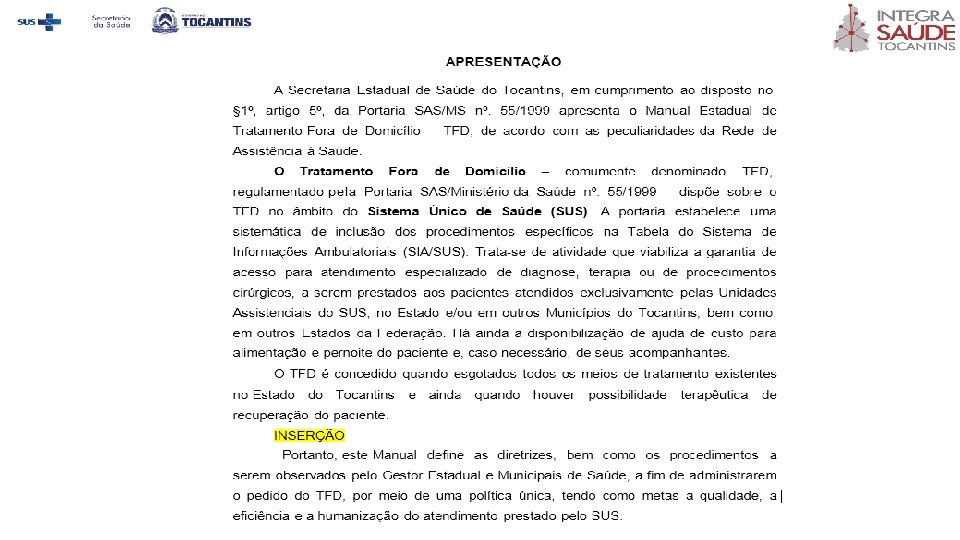 O artigo 5º da Portaria MS nº 055/1999 estabelece que as Secretarias de Estado da Saúde devem propor estratégias de gestão do TFD de acordo com a realidade de cada região. Neste contexto, visando realinhar o Manual de TFD do Tocantins vigente desde de 2003, em conformidade com as novas Portarias Ministeriais e as peculiaridades atuais da rede de assistência à saúde do Estado, a Diretoria de Regulação, elaborou nova proposta de Manual de Normatização do Tratamento Fora de Domicílio.