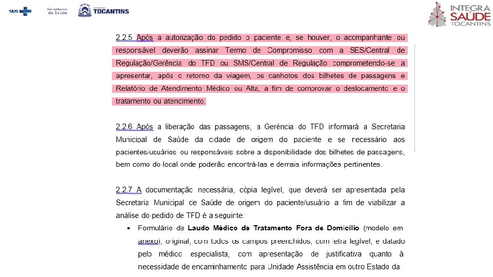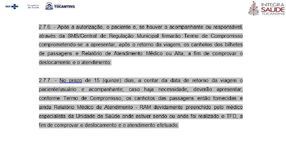 2. 2. 5. Após a autorização do pedido o paciente e, se houver, o acompanhante ou responsável deverão assinar Termo de Compromisso com a SES/Central de Regulação/Setor de TFD ou SMS/Central de Regulação comprometendo-se estar ciente das normativas para TFD e da necessidade de apresentar, após o retorno da viagem Relatório de Atendimento Médico ou Alta, a fim de comprovar o deslocamento e o tratamento ou atendimento.