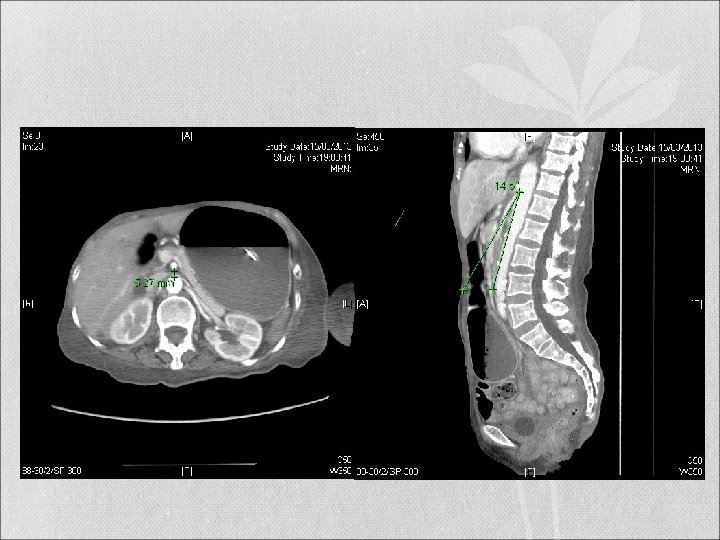 Radiographic Diagnostic Tools Computed tomography (CT) scan • can clearly demonstrate the aortomesenteric angle and distance accurately • the gastric and proximal duodenal dilatation, the duodenal obstruction (site of vascular compression of the duodenum) • local pathologies e. g. aneurysm or neoplasm, etc. • Provide an overall assessment of the abdominal cavity as well as the amount of retroperitoneal fat