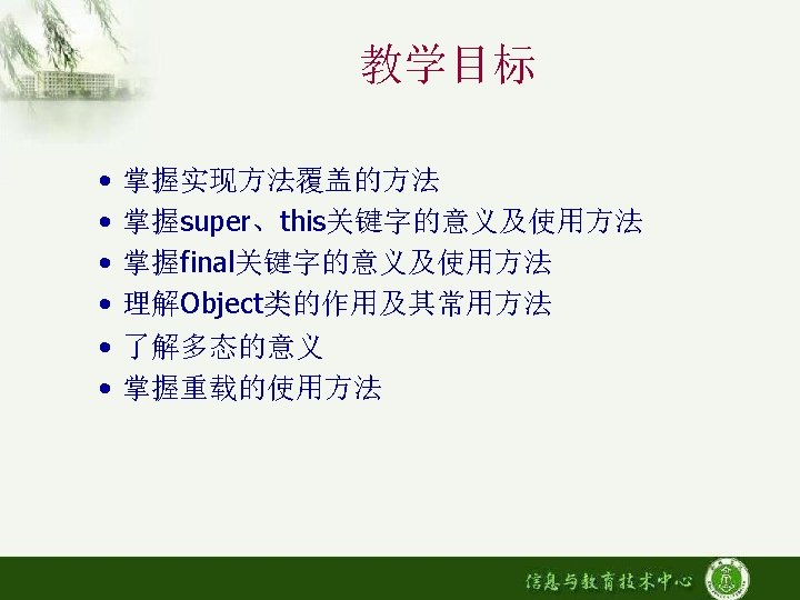 super&this示例(续) class Student extends Person { private String department; //系别 private String specialty; //专业 public void student. Register(String n, String s, int a, String dep, String spe) { super. register(n, s, a); //调用父类方法 this. department=dep; //访问自身成员变量 this. specialty=spe; //访问自身成员变量 } public void show. Student () { //显示学生类数据成员 System. out. println("姓名:"+super. name+",性别:" + super. sex+ ",年龄:" +super. age+ ",系别:" +this. department + ",专业:"+this. specialty); } 方法student. Register()中,使用super表示父类对象, } super. register()即调用了父类对象方法register();使用 this表示当前类对象,this. department即引用了当前类 对象成员department。