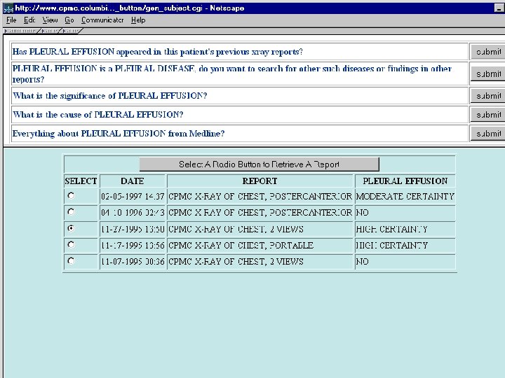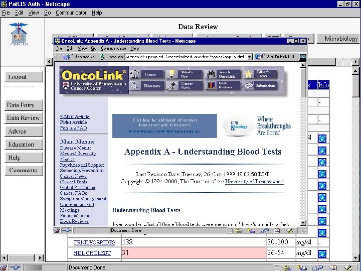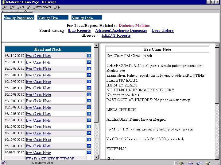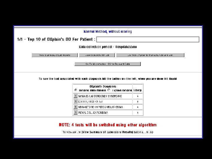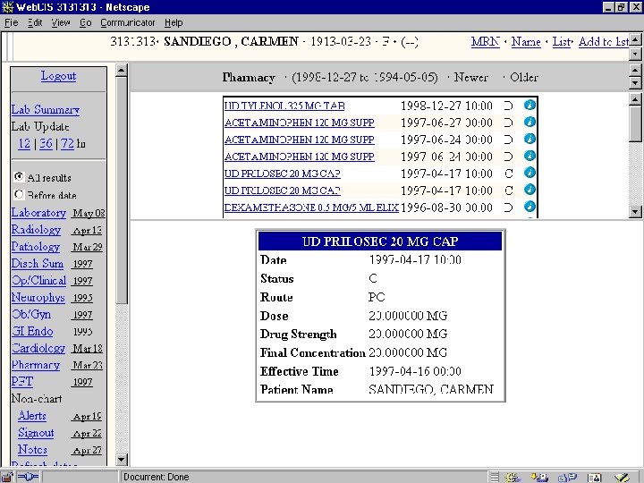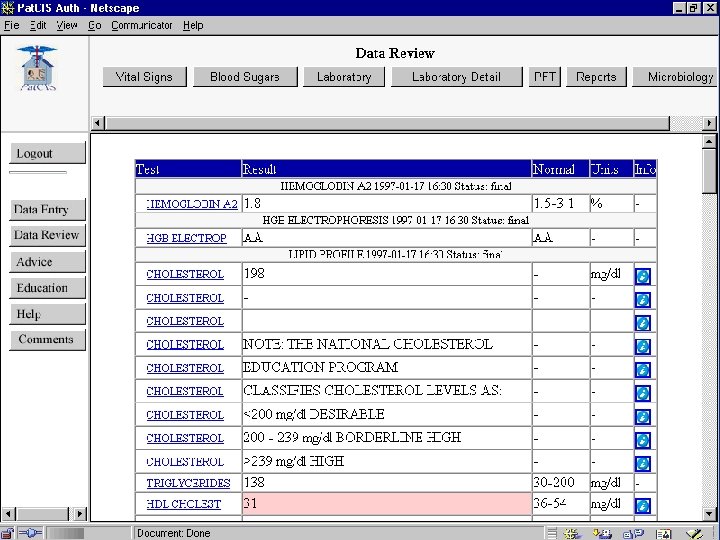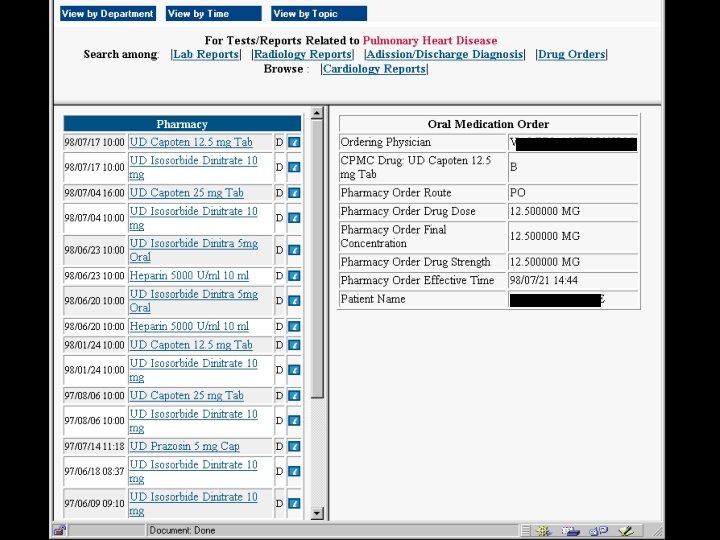 EMR and Decision Support • • • The Medline Button - understand conditions Pharmacy Infobutton - review and teach Cholesterol Guideline - dietary planning Dxplain Button - understand findings Qing. CIS - problem-oriented views