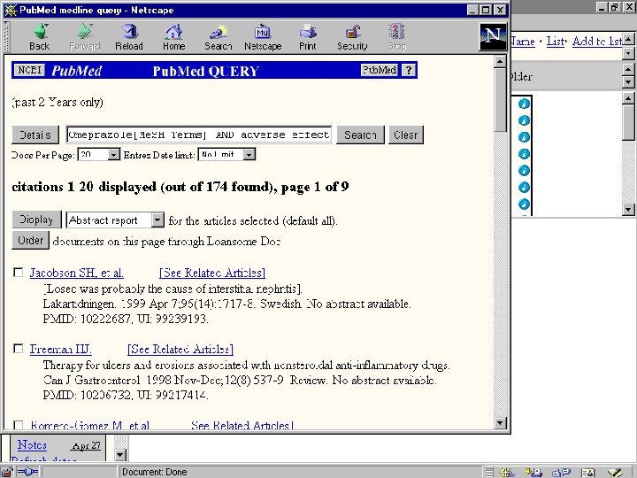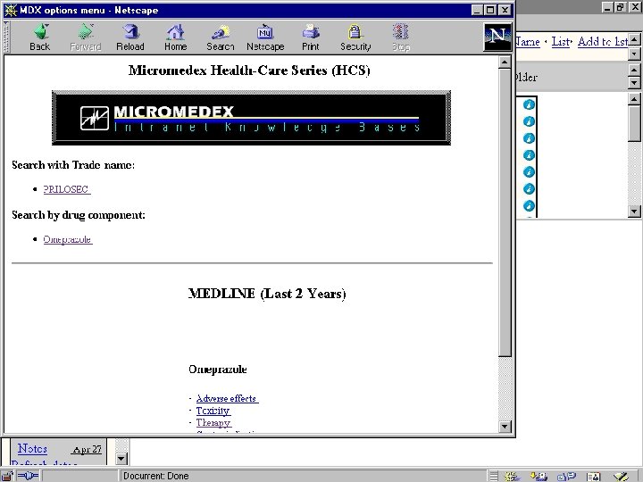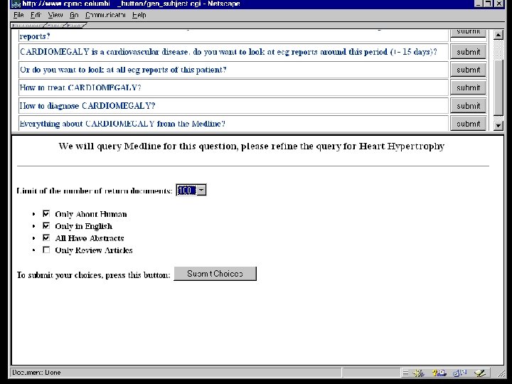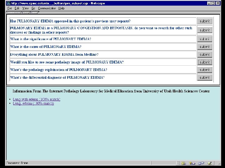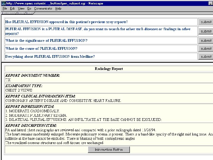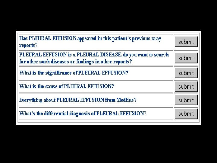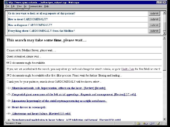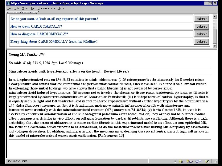 Summary • Decision making requires high-quality, up-to-date, timely information • The EMR generates information needs • The EMR can help satisfy information needs • The Web makes the rest easy • Further study needed: – When do users need information? – What information do they need? – What terminology is needed? – What are the right resources? – How can retrievals be facilitated? – How do we present results?