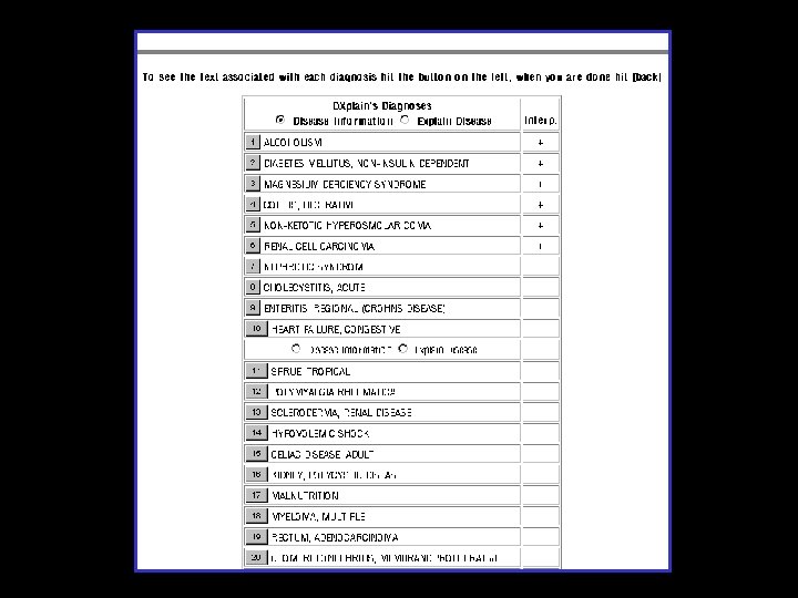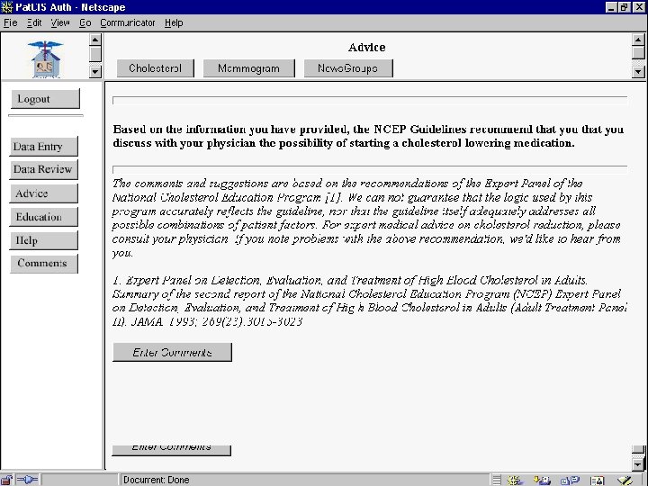EMR and Decision Support • • • The Medline Button - understand conditions Pharmacy Infobutton - review and teach Cholesterol Guideline - dietary planning Dxplain Button - understand findings Qing. CIS - problem-oriented views Pat. CIS - patient education