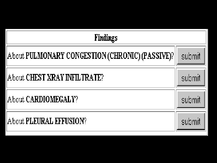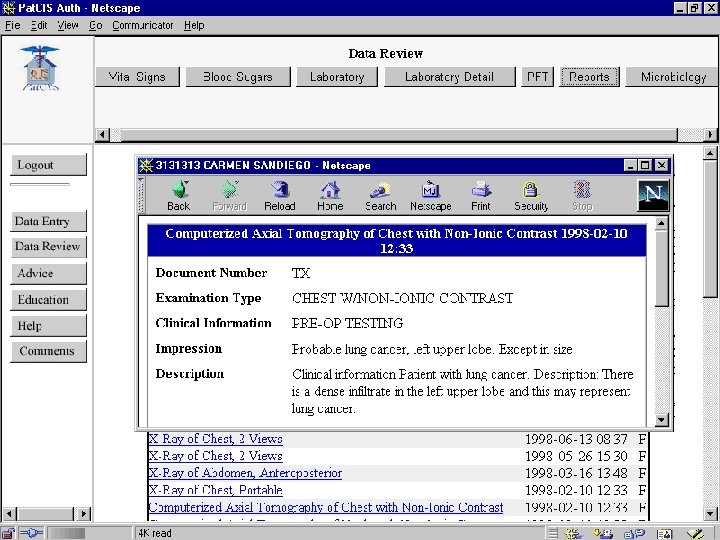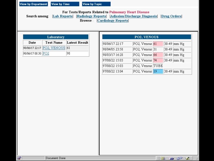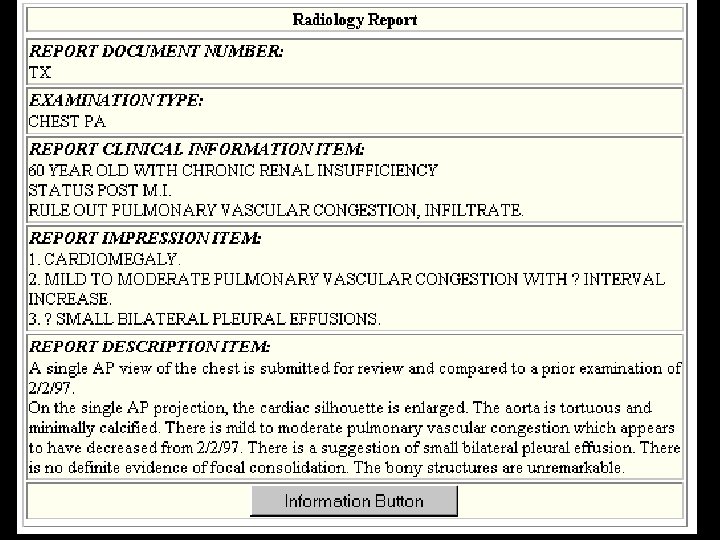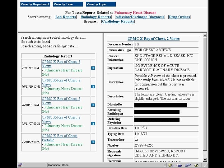 Concept-oriented (Heart) Heart Disease Congestive Heart Failure Angina Cardiac Enzyme Creatine Kinase Intravascular CK Test Admission : 3/14/96 Stroke Lab : 12/28/96 Sickle Cell Test Admission : 2/14/98 Angina Lab : 1/1/99 Blood Type Test Discharge : 1/15/99 CHF Lab : 1/1/99 Cardiac Enzyme Test Chest X ray 2 View Radiology : 2/28/96 Head CT Radiology : 2/1/97 Knee X Ray Radiology : 2/23/99 Chest X Ray