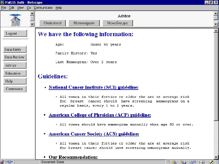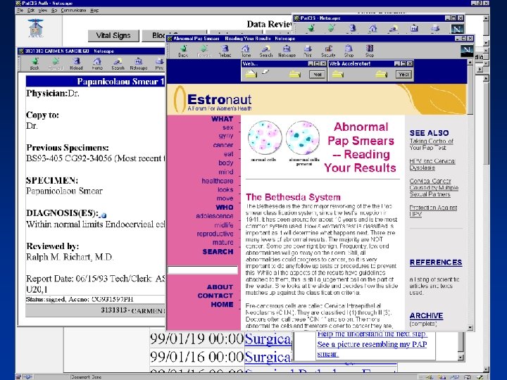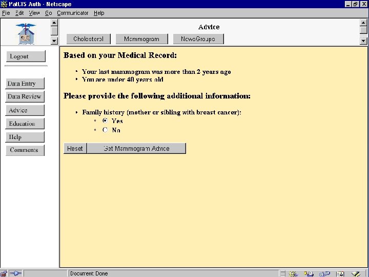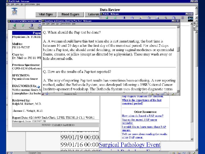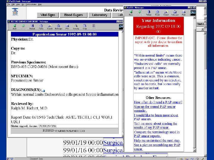 EMR and Decision Support • • • The Medline Button - understand conditions Pharmacy Infobutton - review and teach Cholesterol Guideline - dietary planning Dxplain Button - understand findings Qing. CIS - problem-oriented views Pat. CIS - patient education Lab Infobutton - patient information Microbiology Infobuttons - infection control Mammography Guideline - screening Pap Smear Infobutton - screening