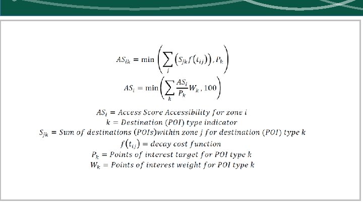 • Access Score – Cumulative access to destinations – Implements a decay cost function allowing for multiple destination in one matrix – User defined target for POIs – Portion of total score on 100 for each POI – Each destination weighted differently based on willingness to travel • Proximity to origin and using NHTS data – Gravity based funtion