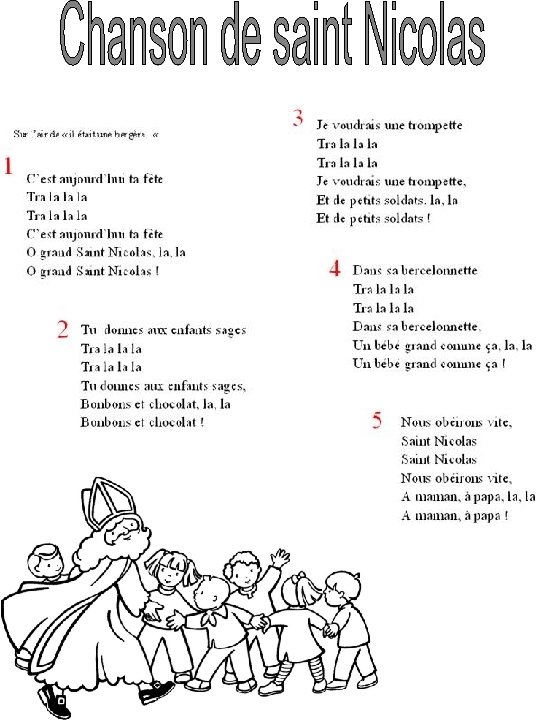 A, A, A, saint Nicolas est là ! (2 x) Saint Nicolas du paradis, Apportez-moi des jouets jolis ! A, A, A, saint Nicolas est là ! Saint Nicolas est là ! E, E, E, saint Nicolas venez ! (2 x) Saint Nicolas du paradis, Apportez-moi des jouets jolis ! E, E, E, saint Nicolas venez ! Saint Nicolas venez ! I, I, I, saint Nicolas merci ! (2 x) Saint Nicolas du paradis, Apportez-moi des jouets jolis ! I, I, I, saint Nicolas merci ! Saint Nicolas merci ! O, O, O, saint Nicolas est beau ! (2 x) Saint Nicolas du paradis, Apportez-moi des jouets jolis ! O, O, O, saint Nicolas est beau ! Saint Nicolas est beau ! U, U, U, saint Nicolas salut ! (2 x) Saint Nicolas du paradis, Apportez-moi des jouets jolis ! U, U, U, saint Nicolas salut ! Saint Nicolas salut !