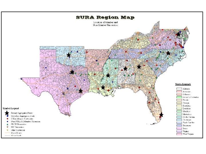 About SURA • Founded in 1980 with a focus on developing Jefferson Lab, a DOE funded high energy physics facility • SURA is a 501(c)3 consortium of 53 research universities from 16 southeastern US states and DC • Created one of the first NSF funded regional network services, SURANet • Sold SURANet in 1995 to BBN • SURA region makes up 35% of US population