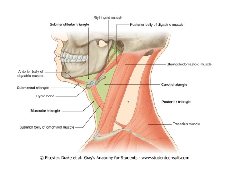The Muscular Triangle • Contains the sternohyoid and sternothyroid muscles, as well as the lateral edges of the larynx and the thyroid gland.