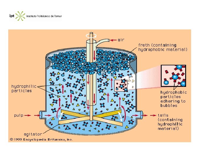 Treatment of ore by flotation The ore is crushed, and mixed with water, to which is added an oil. This will adsorb to the surface of ore, which causes the increase in the contact angle of the SLG interface. Other particles remain wet by water. The molecules of oil (oil collector) are amphyphylic, creating a hydrophobic surface. It is then added a sparkling agent and forced air into the bottom of the vessel. The particles adhering to the air bubbles comes to the surface, where they are collected rich in metal (see figure)